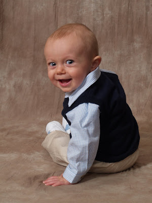 He's cruising on the furniture, pinches things between his fingers wonderfully, smiles at everyone, and yesterday, June 2nd, he learned how to click his tongue. So cute. He also has a turbo crawl, and is fast. James has learned to climb the stairs, but can't come down yet, so we watch him. James has five teeth, 3 top, 2 bottom, with two more coming in right now. He is curious about everything around him, and we love him so.